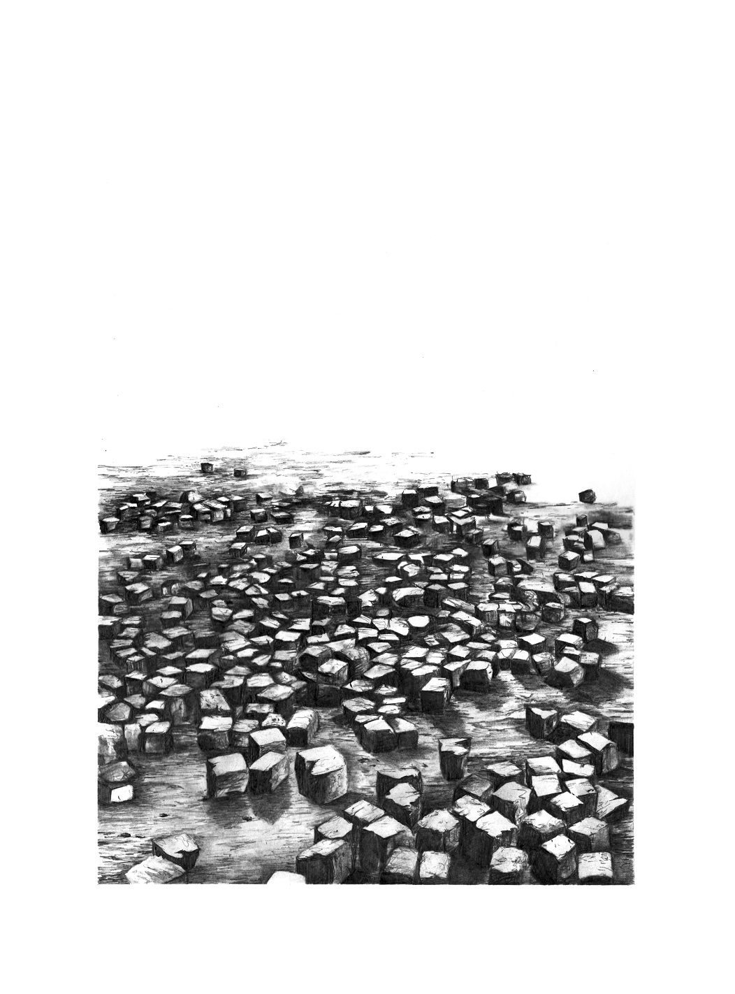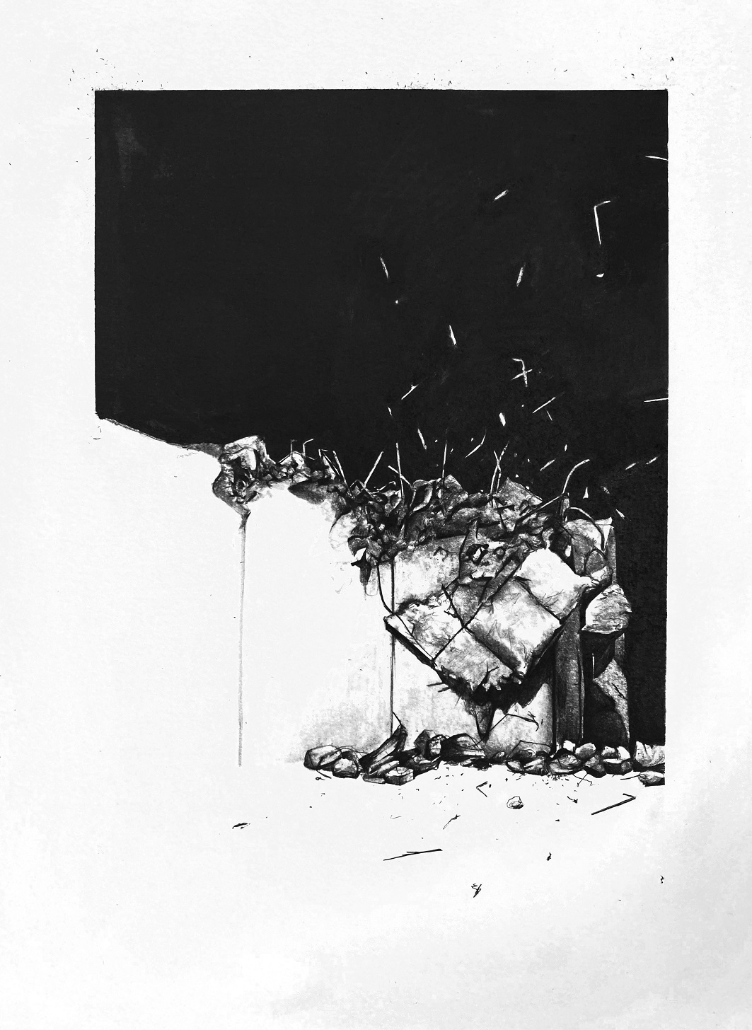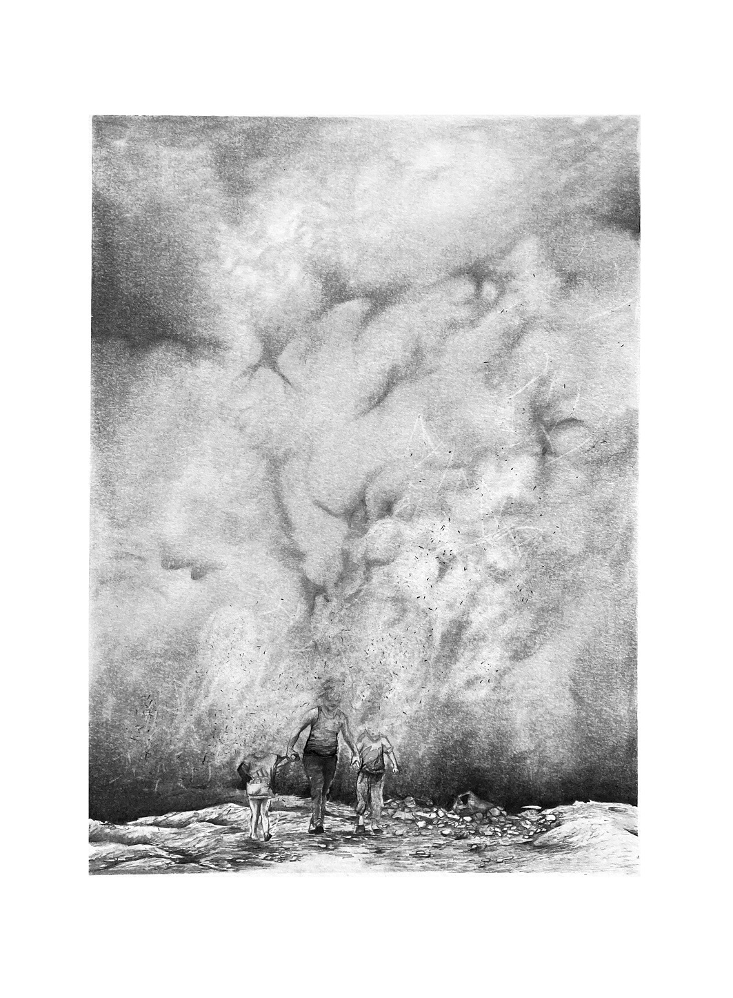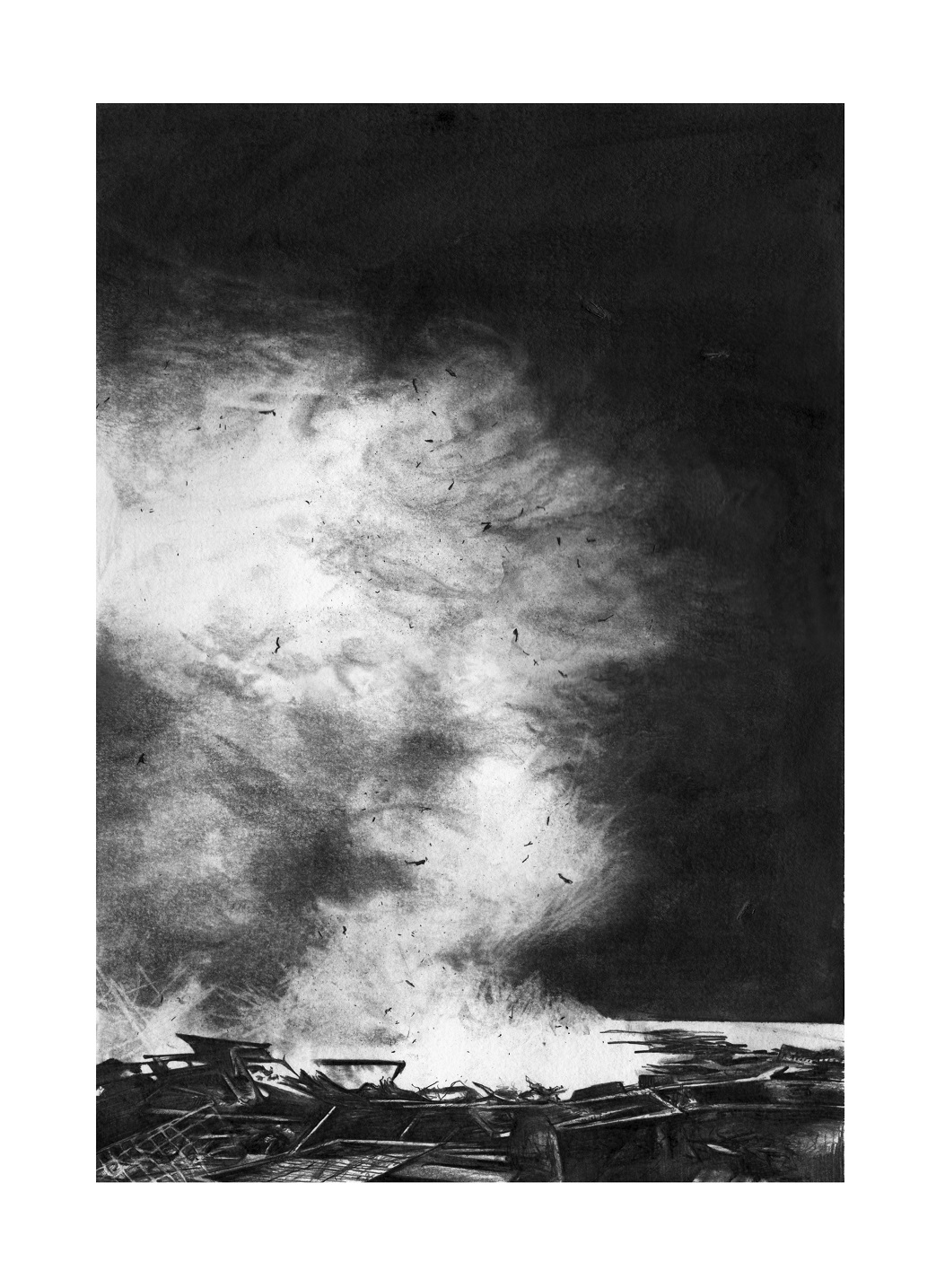 Dans cette série de dessins, des conflits géologiques et géopolitiques sont mis en scène dans des paysages perturbés par le vent, les gravats, la ruine : à partir d’évènements réels saisis par des captures d’écrans et des photographies, je donne à voir une représentation de la réalité dans laquelle subsiste la trace de l’humain.