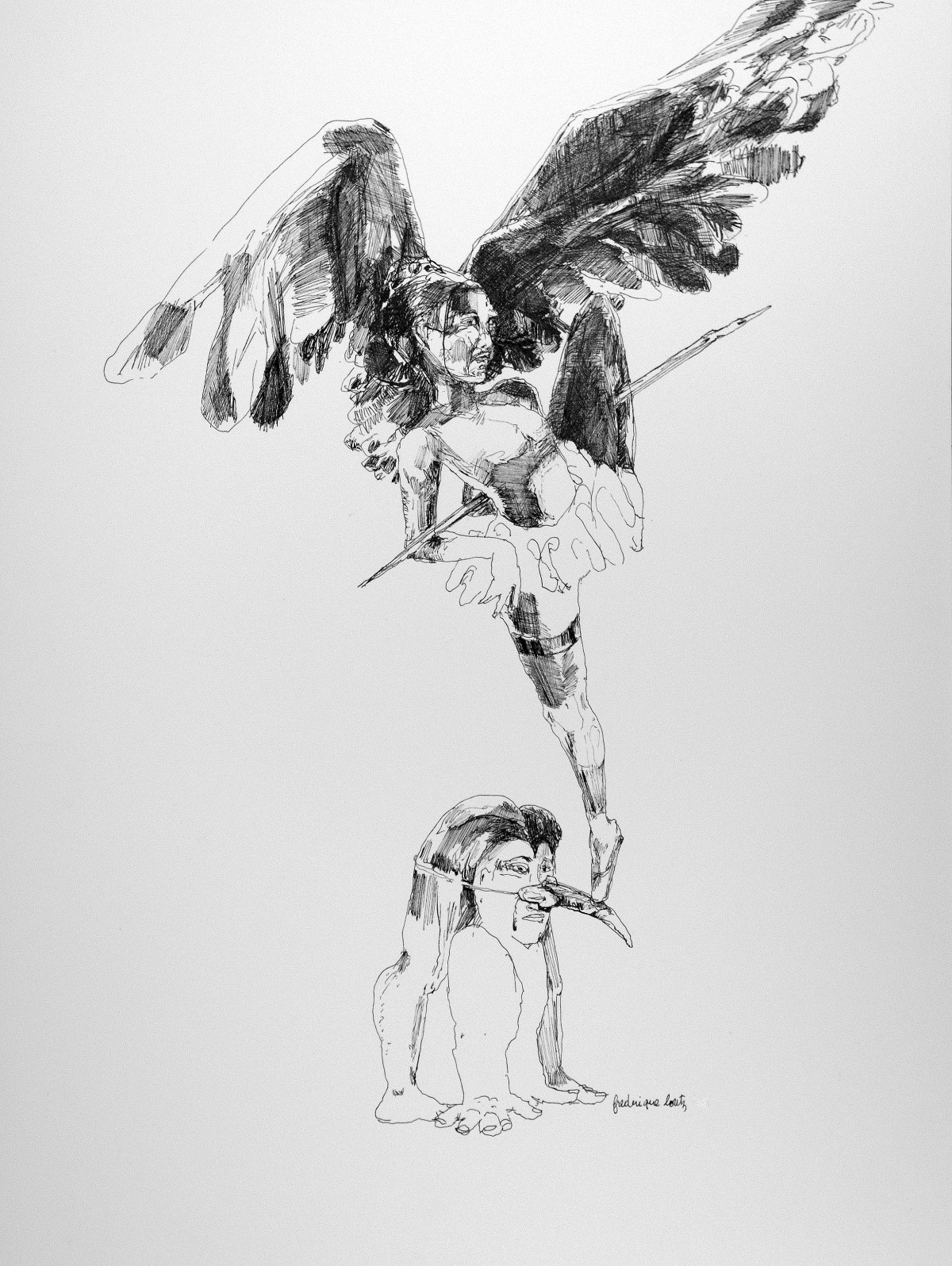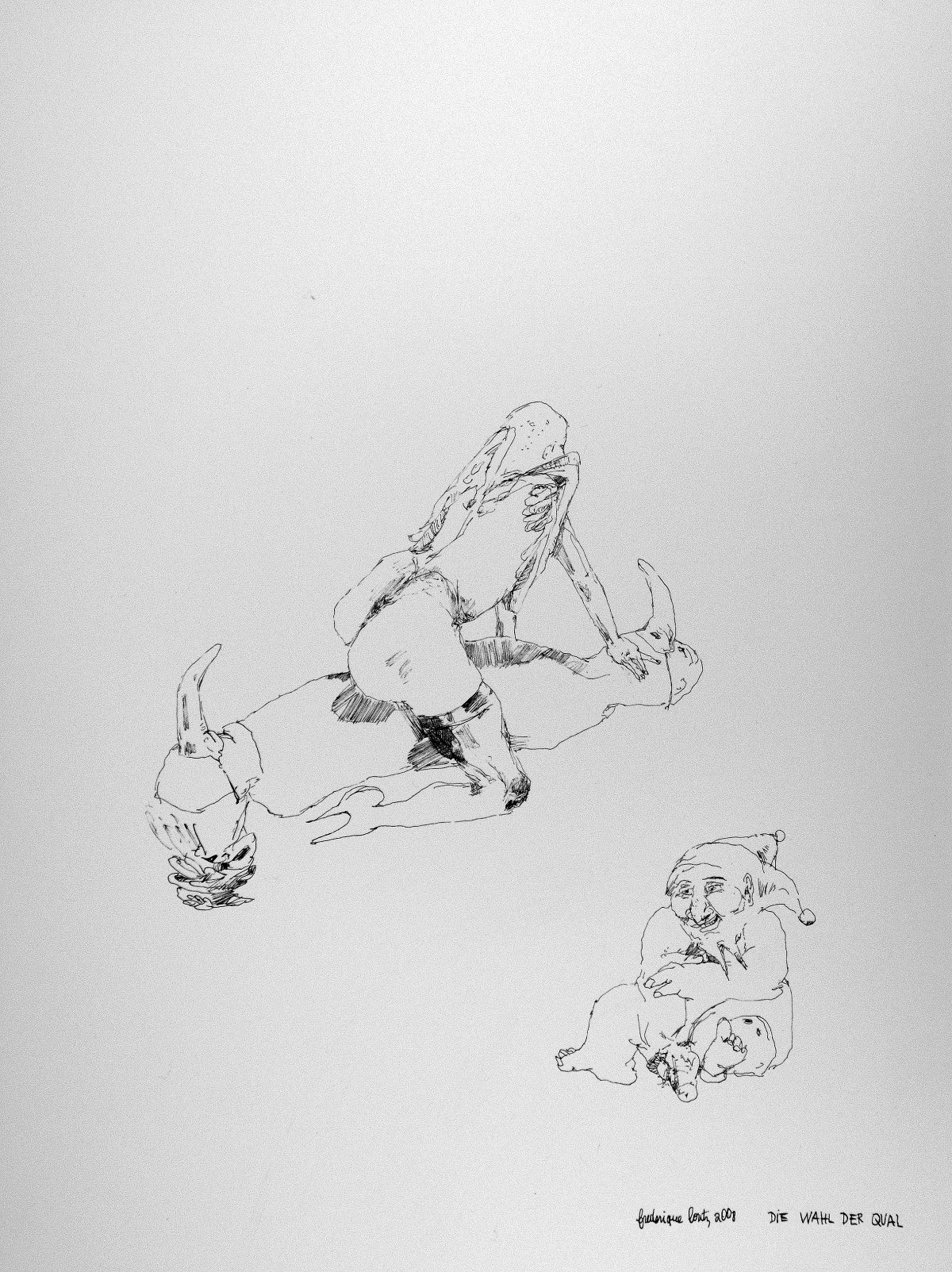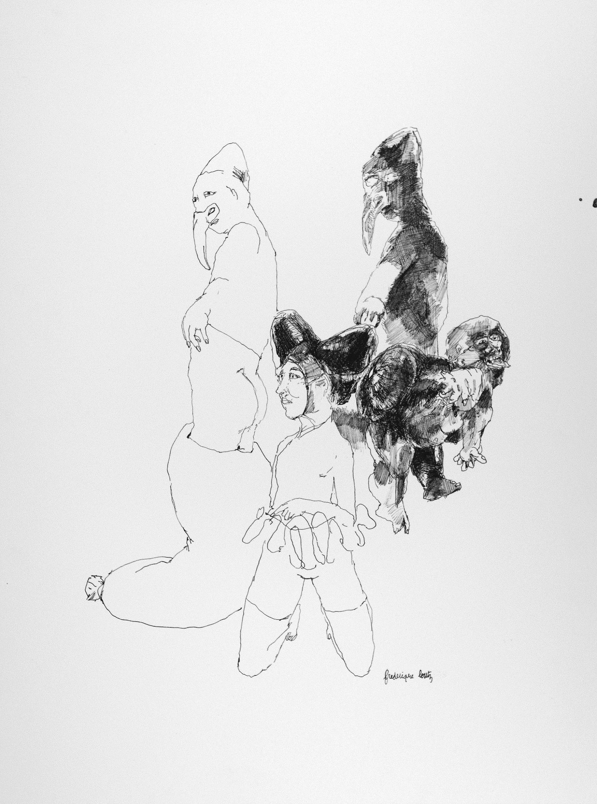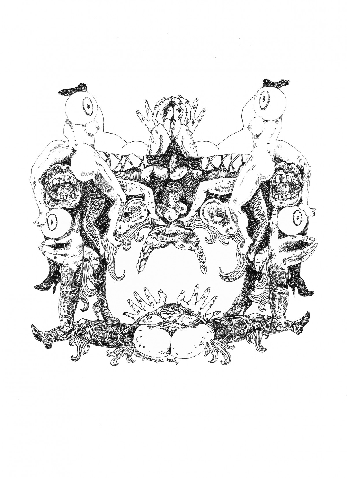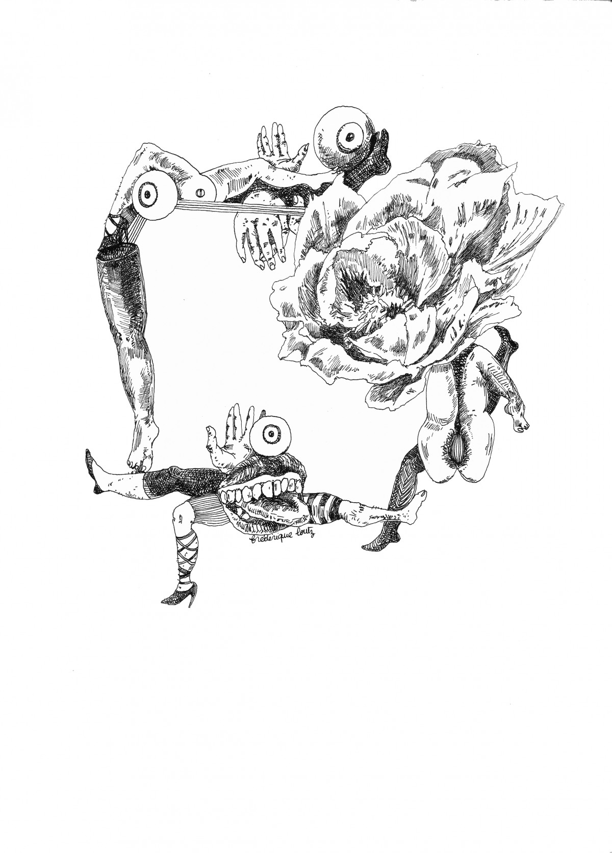 Actes jouant un rôle sous le masque de la nudité, les dessins de Frédérique LOUTZ se donnent en spectacle absurde : un secret se dévoile tout en recouvrant ce qu’il veut montrer. Le grotesque tente la grâce : des femmes se saluent de leur chatte, des queues se décuplent avec délicatesse. Une imposante obscénité se pousse hors de la perspective pour libérer notre regard et l’ouvrir sur le comique de la tragédie de nos vies.