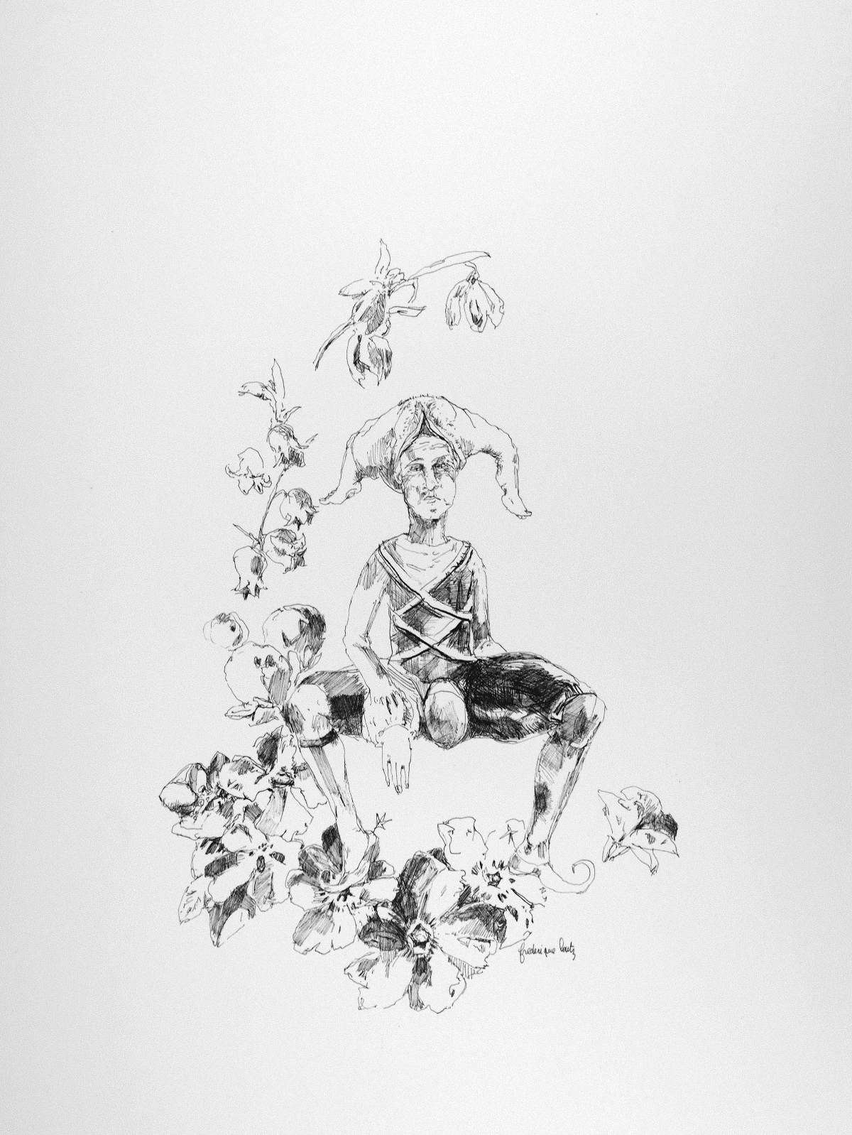 L’objet récurrent dans ces dessins est le corps, corps humain et corps des objets : membres, faces, postures certes, mais aussi gant, cruche ou escalier. Un paysage ou un bouquet de renoncules s’incarnent par l’emploi d’une syntaxe différente – même une maison n’est plus ici telle que nous nous la représentions.