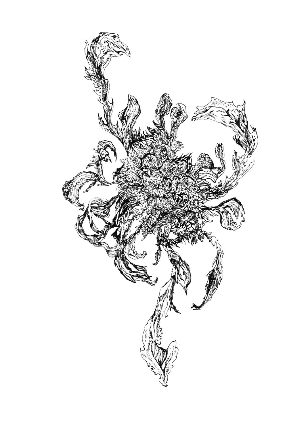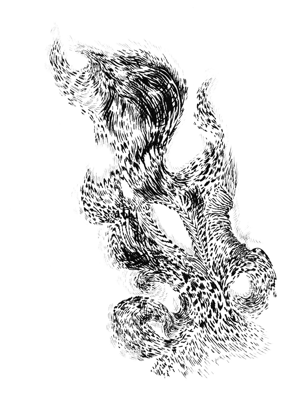 Mes premiers pas vers le travail de dessin ont été guidés par les formes et motifs de la nature : animal et végétal revenus par fragments, formant des paysages grotesques voire monstrueux, taches ou zébrures comme autant de ponctuations ou de traces de gestes frénétiques, motifs se fondant et se confondant – quelle différence parfois entre écorce, écailles, poils, herbage ou surface frémissante de l’eau ?